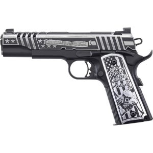 United We Stand Special Edition 1911, Stainless Steel frame and slide, checkered frontstrap, .45 Cal., 5″ barrel, aluminum engraved grips, custom engraved with “United We Stand” and Matthew 12:25 Bible verse, finished in Black Armor Cerakote with stainless accents and night sights.
