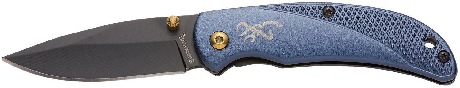 Browning 3220341 Prism 3 EDC Folding 2.38″ Plain Black Oxide 7Cr17MoV SS Blade, Navy w/Brass Accents & Logo Anodized Aluminum Handle, Includes Pocket Clip