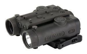 The LE420G is a 7075 Aluminum bodied multi- laser aiming device. Includes class IIIA visible green laser, class 2M IR laser, and IR Illuminator coaxially mounted for easy zeroing. Also features a 600 Lumen white light, IR Illuminator focus adjustment, quick release picatinny rail mount, remote pressure switch, IP67 water resistance, and is powered by two CR123 batteries for increased run-time.