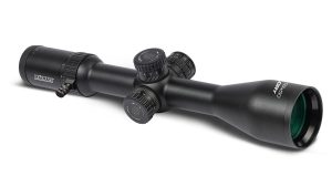 The scope's engraved German No. 4 reticle is positioned in the first focal plane so its crosshairs enlarge with magnification for confident targeting and will show in your choice of blue or red as conditions dictate. Impact point corrects at 1/4 MOA per click with a total elevation and windage adjustment range of 90 MOA; the turrets are lockable and easily resettable for zero to allow quick response to changing circumstances in the field.