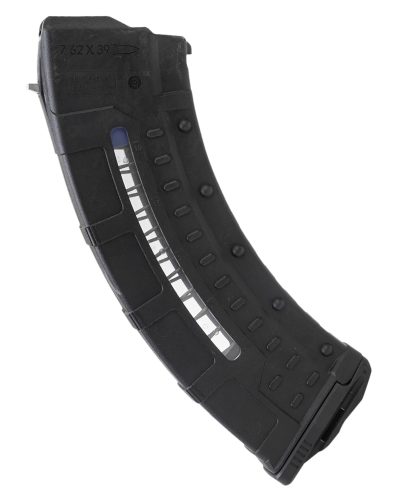 Durable Impact Resistant Glass Fiber-reinforced Matte Black Polymer Construction. Steel-reinforced Locking Lugs. Reliable Feed High Visibility Blue Follower and Stainless-steel Spring. 30 Round Capacity with Left and Right Side Co-molded Polymer Windows and Debossed Round Count Indicators. Raised Bosses for Added Grip Retention. Easy Disassembly and Maintenance with Removable Flared Floor Plate
