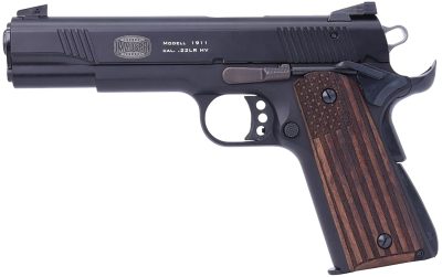 Mauser Rimfire 4110608 1911 22 LR 10+1 5″ Black Steel Barrel, Black Serrated Aluminum Slide, Black Aluminum Frame w/Beavertail, Molded Wood Flag Grip, Ambidextrous