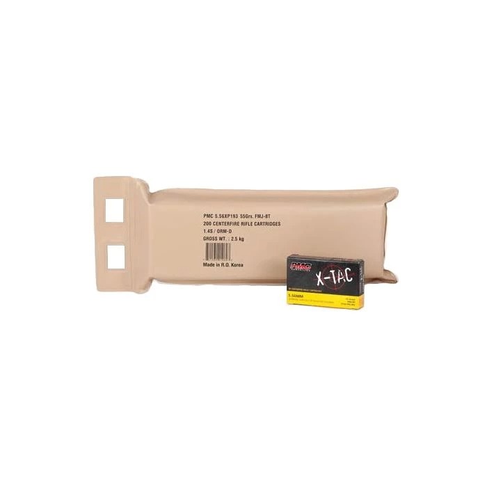 10 vacuum sealed 20rd boxs of 55gr 5.56 NATO FMJ-BT ammo from PMC Ammunition Manufactured to the exacting specifications required by such organizations and demanded by our customers, X-TAC™ is the choice for the professional and enthusiast alike. At PMC, we know your job demands that you think of everything. But we also know that when the chips are down you shouldn’t be thinking about your ammunition. Battle Packs contain 10 boxes, vacuum sealed together. Technical Specifications MPN 5.56X Bullet Type: FMJ-BT Weight: 55 grain Velocity (feet per second) Muzzle: 3270 100 Yds: 2898 200 Yds: 2555 300 Yds: 2237 400 Yds: 1943 500 Yds: 1674 Energy (foot-pounds) Muzzle: 1306 Bullet Path (inches) Muzzle: -1.50 100 Yds: 0 200 Yds: -2.6 300 Yds: -10.6 400 Yds: -25.6 500 Yds: -49.9 Ballistic Coefficient 0.243 Bullet Length 0.740 Sectional Density 0.156