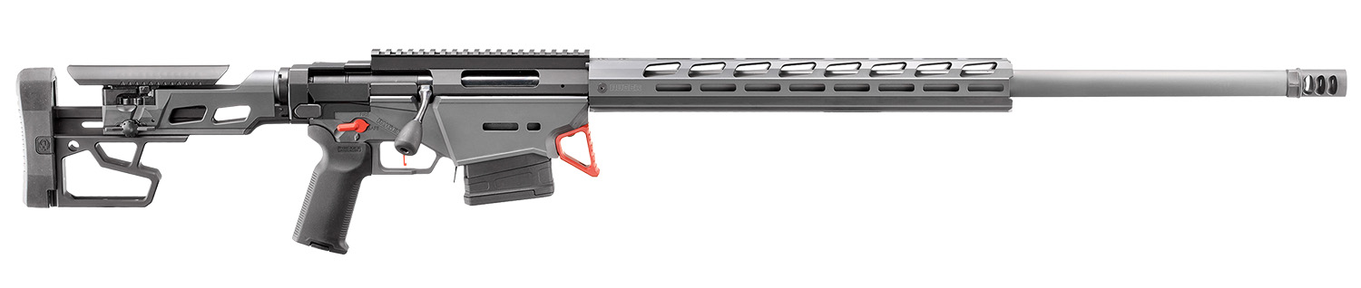 The Ruger Precision features a heavy-contour (.950″ at the muzzle) barrel; APA muzzle brake; TriggerTech Two-Stage Trigger w/Frictionless Release Technology; buttstock allows for easy, intuitive and secure adjustment to conform to any shooter or style and is adjustable for length-of-pull; cheek rest height and horizontal position; as well as buttpad height; cold hammer-forged, chrome-moly steel barrel with 5R rifling at minimum bore and groove dimensions, minimum headspace and centralized chamber; handguard features a target-style flat bottom to improve stability and includes an integral bottom 1.50″ dovetail (compatible with RRS S.O.A.R. and similar QD systems) and features Magpul M-LOK slots on all four sides; ambidextrous manual safety; 20 MOA Picatinny rail secured with #8-40 screws; Magpul MOE-K2+ grip; bolt disassembly tool is stored in the Ruger Precision rifle billet aluminum bolt shroud for easy striker channel cleaning. Includes two 10rd Magpul PMAG magazines.