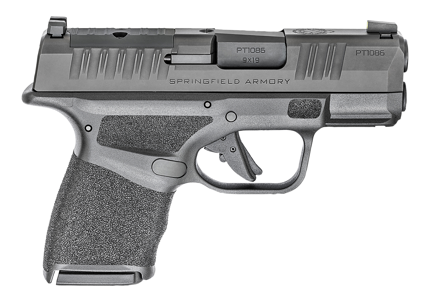 Springfield Armory micro-compact Hellcat features unique top slide serrations to maximize your grip on the slide; rear slide deck is cut to accept a micro red dot; non-proprietary accessory rail allows you to accessories with your favorite light and/or laser; Tritium/Luminescent front sight, Tactical Rack U-Notch rear sight; reversible mag release, loaded chamber indicator and custom pressure activated grip texture. Gear Up 25 package includes Crimson Trace CT-1500 Red Dot Optic, 5 magazines and dual range bag.