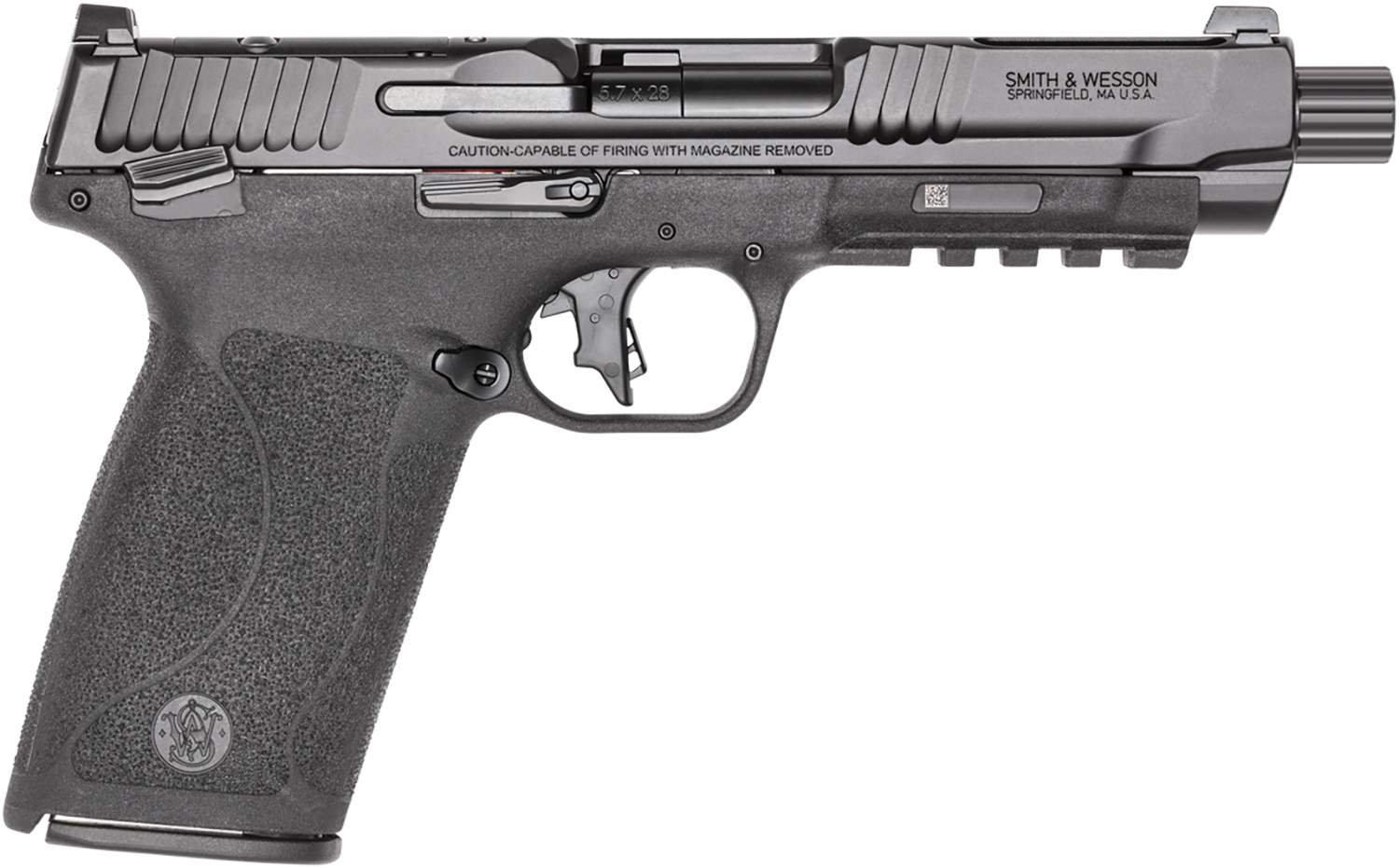 The M&P 5.7 with its rotating 5″ Tempo Barrel System utilizes the ballistics of the 5.7x28mm round in tandem with the repeatability of the Tempo System. Get worry-free consistency, in a 22+1 handgun. The M&P 5.7 features internal hammer-fired, gas-operated, locked-breech TEMPO barrel system (barrel doesnt cam open until bullet passes gas port); slim, optimally textured grip; ambidextrous slide stop; Manual Thumb Safety; reversible magazine release; slide cut for optics; flat-face trigger for consistent finger placement allows for more accurate and repeatable shooting; Picatinny-style rail; forward slide serrations and SA trigger break. Includes two magazines.